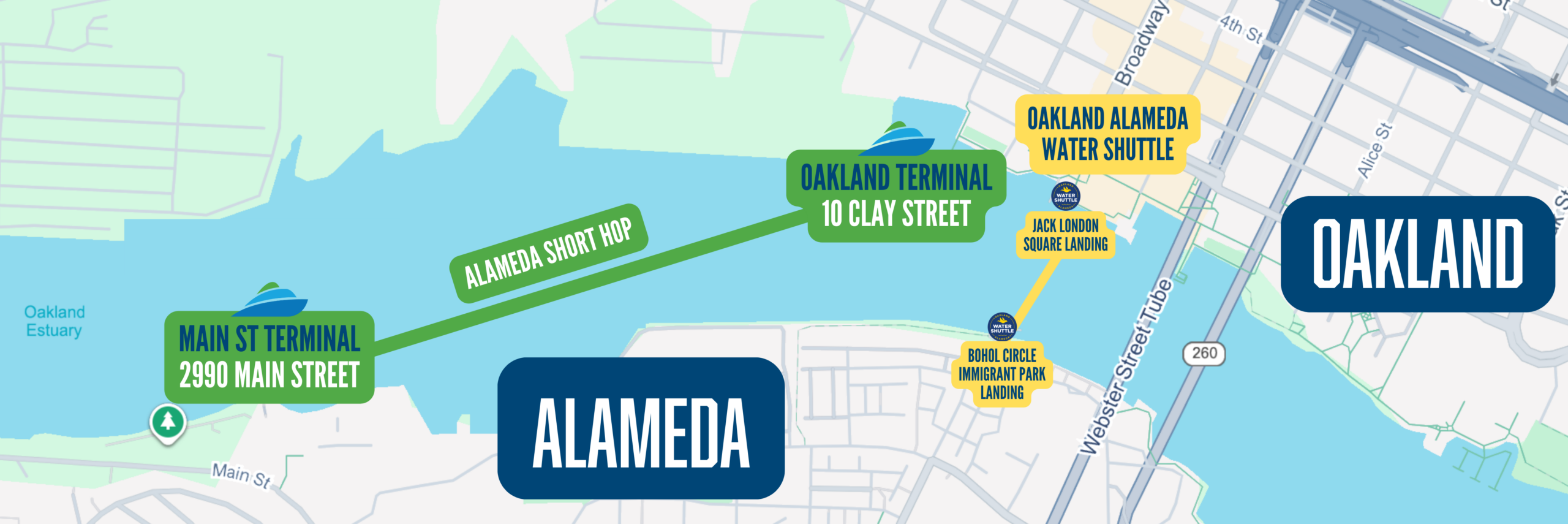 SF Bay Ferry operates two routes to cross the Oakland Estuary: The Water Shuttle between Jack London Square & Bohol Circle Immigrant Park, and the Alameda Short Hop between the Oakland & Main Street Alameda Ferry Terminals.